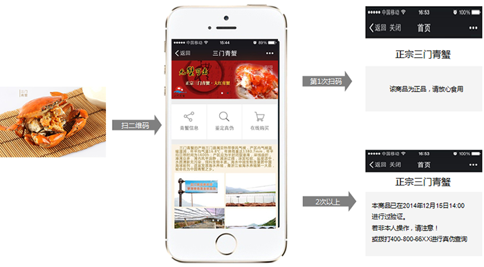 - 二维码防伪结合了以上两种防伪方式的优势,解决了传统防伪极低查询率的问题,消费者用手机扫一扫即可辨别真伪。一物一码,每个二维码对应一个唯一的网址,后台系统会记录该网址的访问时间、机型、次数、地点。产品防伪模块的后台管理数据高度加密、易码平台提供混合云合作模式,核心数据企业可实现自主管理。